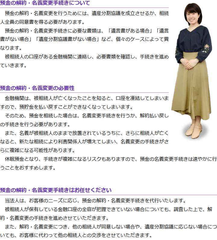 私たちは、このような預金の解約・名義変更手続きにも対応しており、ご相談やご依頼をお受けしています。